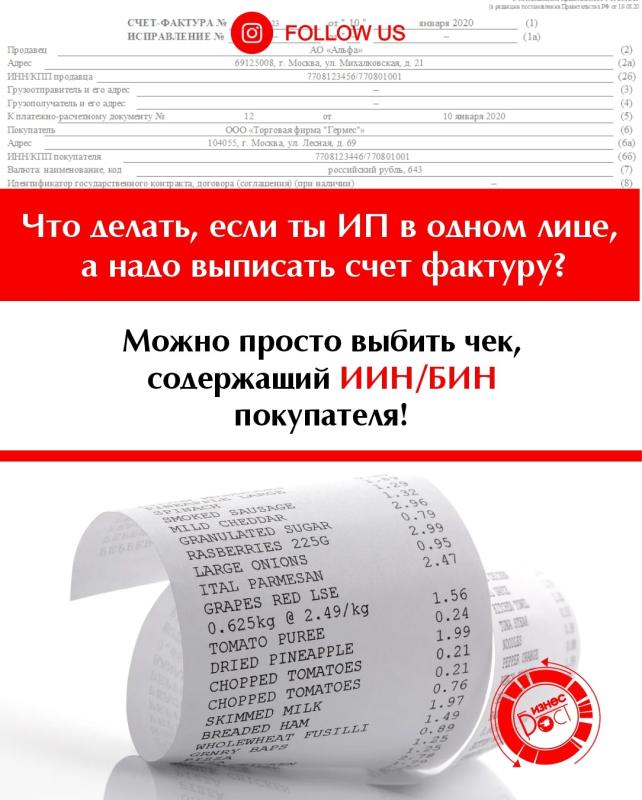 Настаивать не было смысла, но и закрывающие документы хотелось получить, и тут мы вспомнили, что еще в 2022 году вышла поправка в налоговом кодексе (ст.242) о том, что заменой электронной счет-фактуры может служить чек, в котором указаны ИИН/БИН покупателя.