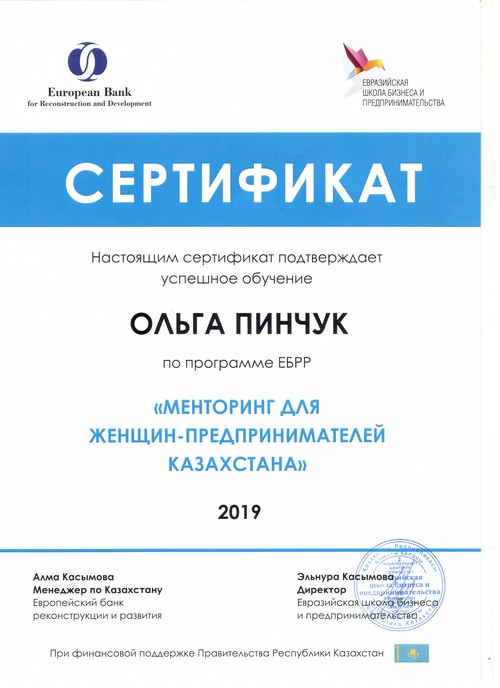 В 2019 году ИП ЦОБ «Бизнес Рост», в лице руководителя Пинчук О.В. принял участие в программе ментроство для женщин-предпринимателей, организованной государством при поддержке Евразийского банка реконструкции и развития. В результате 9 месячной работы по внедрению новых бизнес-инструментов в компании, ИП получил звание «Прорыв года 2019». За данный период в компании было начато внедрение структуры компании, т.е. распределение обязанностей по отделам, деятельность по созданию отдела продаж, созданы обучающие регламенты для сотрудников, проведено несколько тренингов по повышению лояльности к клиентам, начата реконструкция нового офиса и многое другое.